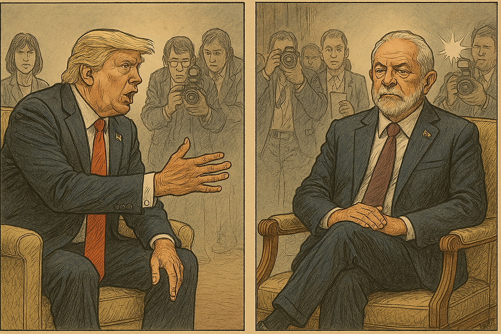 A imagem fala antes das palavras: Lula, pernas cruzadas, olhar fixo, expressão de quem já entendeu tudo o que o outro ainda vai tentar dizer. À frente dele, Trump gesticula, busca câmera, tenta o jogo do protagonismo performático. Mas o palco mudou — e o roteiro também. O Brasil não entra mais em cena para bater palma; entra para ditar o tom.