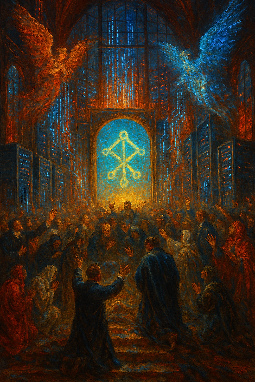 As paredes são de vidro, os anjos são cabos, e o incenso é o calor dos servidores. Dentro, sacerdotes de jaleco falam a língua das máquinas, e cada linha de código é uma prece por eficiência. Não há cruz nem altar, apenas telas que se iluminam com a mesma reverência com que outrora se acendiam velas. A promessa, porém, é a mesma de todas as religiões imperiais: salvação — desta vez não da alma, mas da obsolescência.