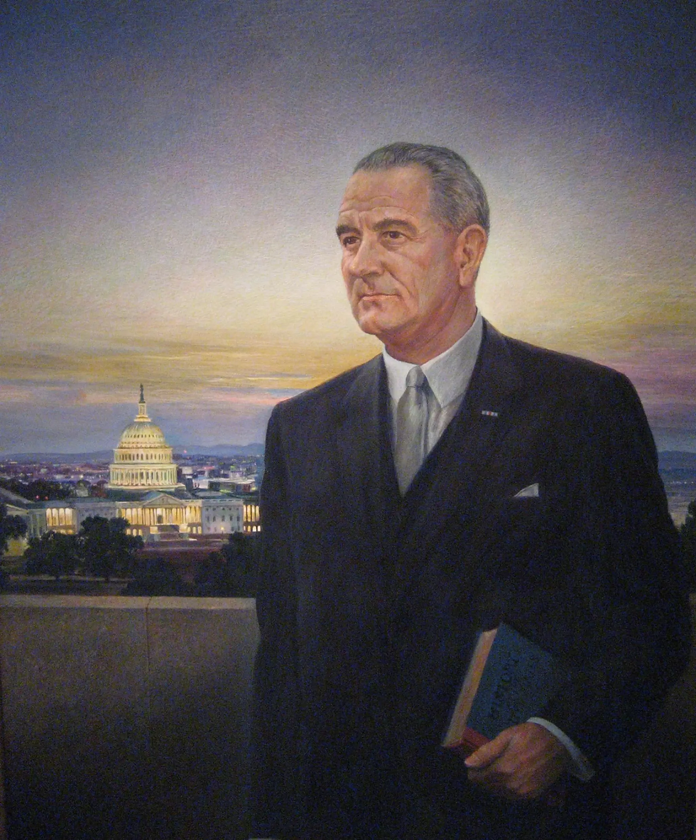 Lyndon B. Johnson queria ser lembrado como um estadista pacificador. Peter Hurd no entanto pintou o político texano gordinho, de orelhas grandes e expressão difícil e cansada. Johnson, famoso por seu temperamento, rejeitou a obra e o quadro foi banido da Casa Branca. A recusa de Johnson em aceitar suas próprias feições rudes revela o desejo do político de controlar não apenas a política mas a própria biologia.