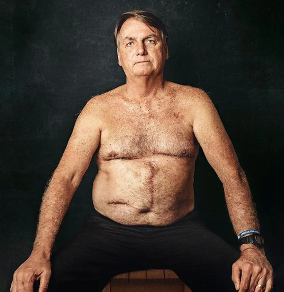 A fotografia mostra Jair Bolsonaro em ambiente fechado, sob iluminação dura e enquadramento frontal, enfatizando o desgaste físico e a cicatriz. O corpo aparece como prova e argumento, não como problema a ser interrogado.